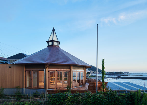 Our Hayama store is a one-of-a-kind twelve-sided “hall of light” built by Shinsoken and a team of first-class traditional Japanese carpenters. When darkness falls, the six triangular windows rising from the roof in a hexagonal spire glow with a warm light. From a distance, the store could almost be a lighthouse.