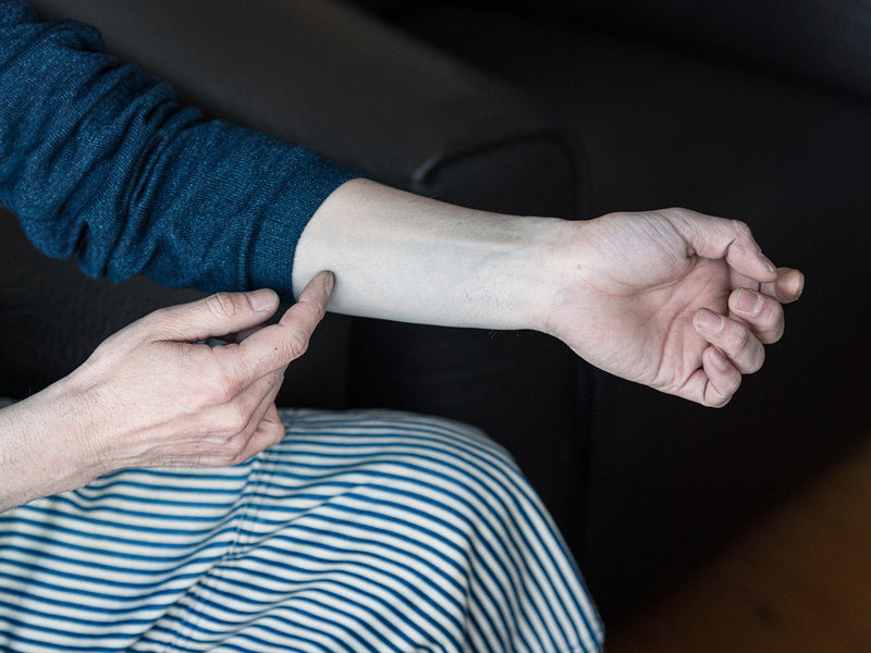 그는 수십 년 동안 입어 온 인디고 티셔츠의 넥라인을 가리킨다. 시간 속에서 부드러워진 칼라에는 오랜 착용의 흔적이 고스란히 배어 있다.