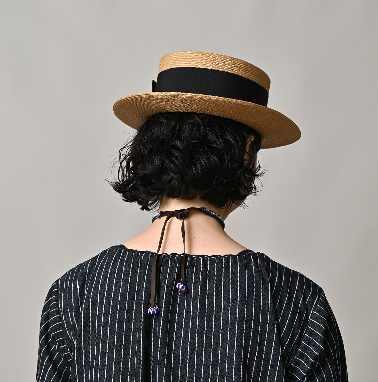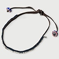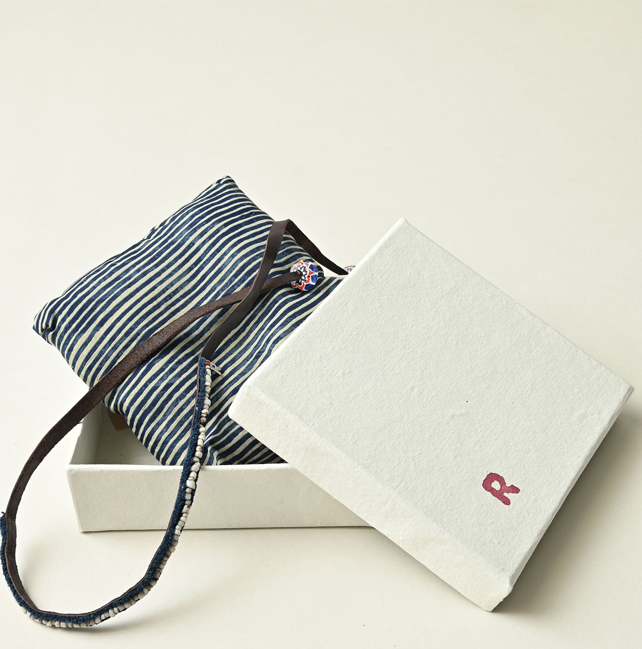 Antique beads that have traveled a long, long journey to become accessories. Dragonfly beads, R charms, and indigo fabric turned into fringe. When they all come together, a unique expression is born. No two beads share the same shape or the same glow.
