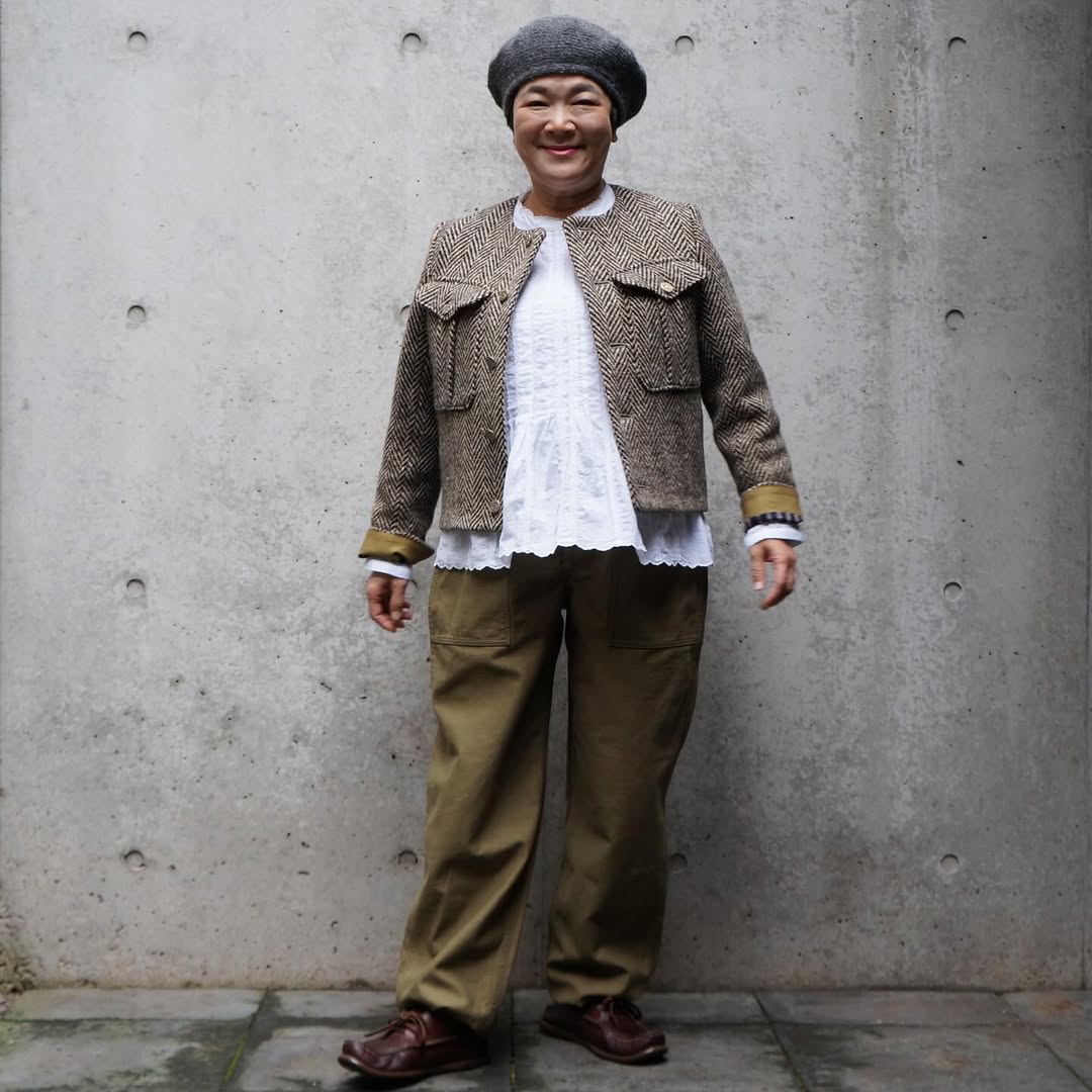 With its short, compact silhouette, this collarless jacket combines refined details such as dress-jacket-style pockets and striped sleeve linings for a touch of quiet sophistication.