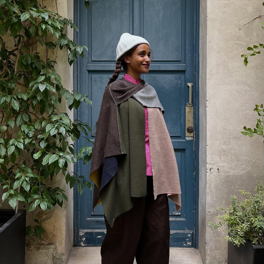 The knitted fabric has been cut and sewn as if it were woven cloth. This poncho drapes gracefully and moves with ease, letting you enjoy which colors you wish to show. It can also be wrapped around and worn freely as a scarf.