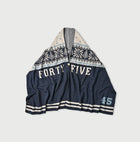 When draped over the shoulders and fastened with a button, the brand logo aligns horizontally—evoking the look of a classic Fair Isle sweater. This piece functions beautifully as both a poncho and a stole.