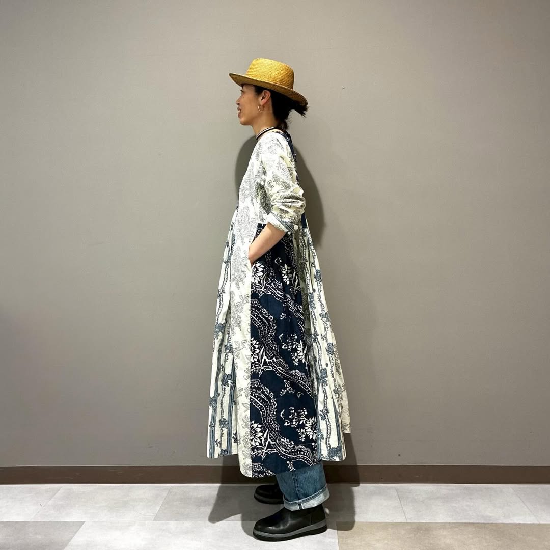 Western patterns inspired by vintage fabrics harmonize beautifully with the handcrafted quality of Indian block printing. Three patterns are combined with an emphasis on vertical panel lines for a striking patchwork dress.