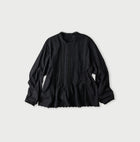 Delicate lace peeks through the fine tucks, finished with care so that even the hidden stitches remain invisible. The hem is softly gathered with stitched tucks, and the scalloped edge evokes the romance of a vintage blouse. A creation by 45R that reflects Japanese craftsmanship at its most heartfelt.