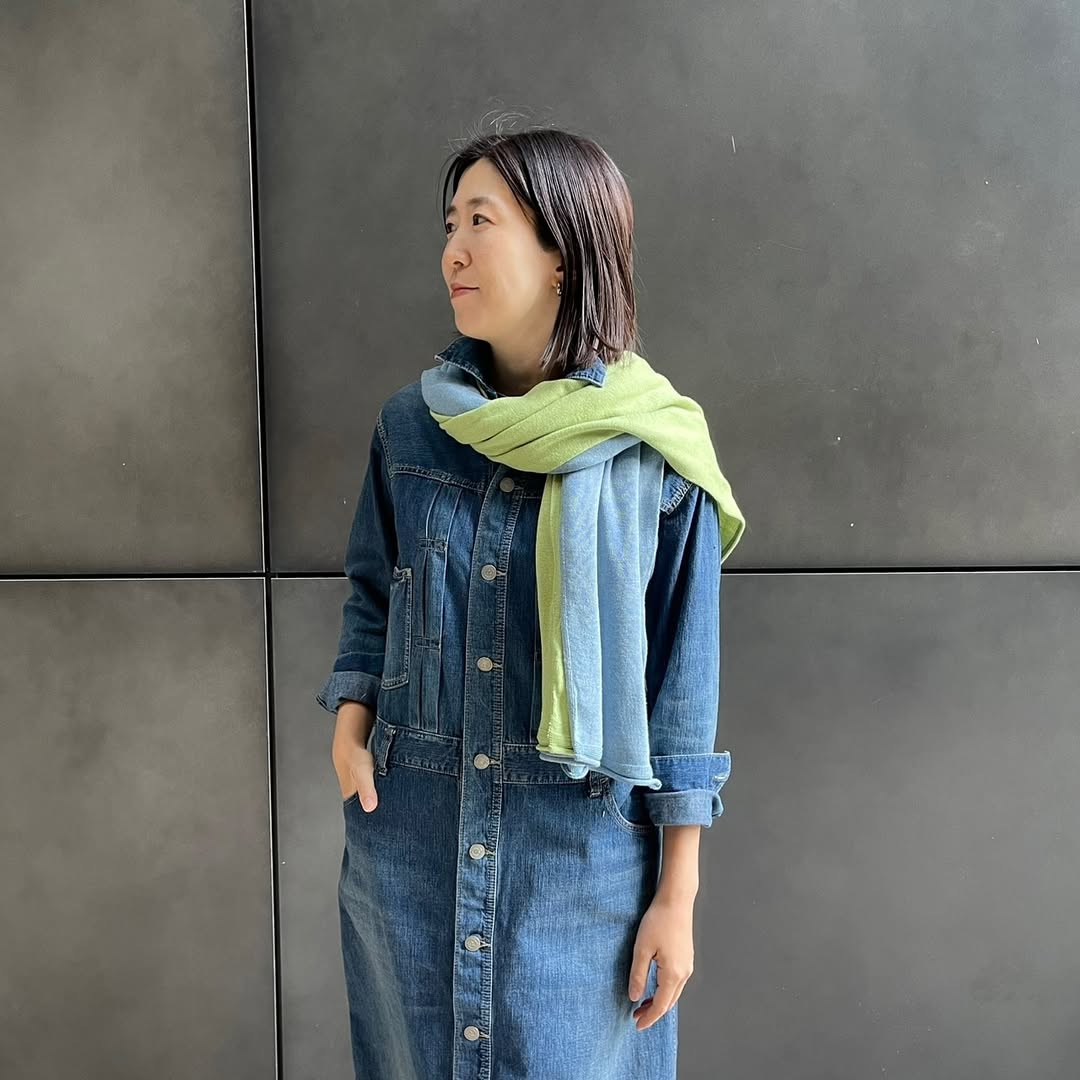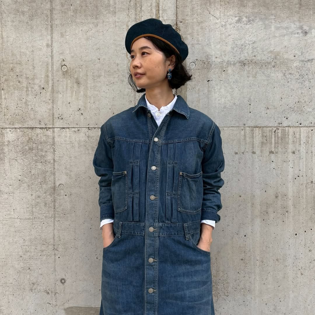 A trucker-style dress that looks like a denim jacket and skirt set. It’s been carefully processed to achieve a vivid blue color. Leave the front open and wear it like a coat for a cool, effortless look.