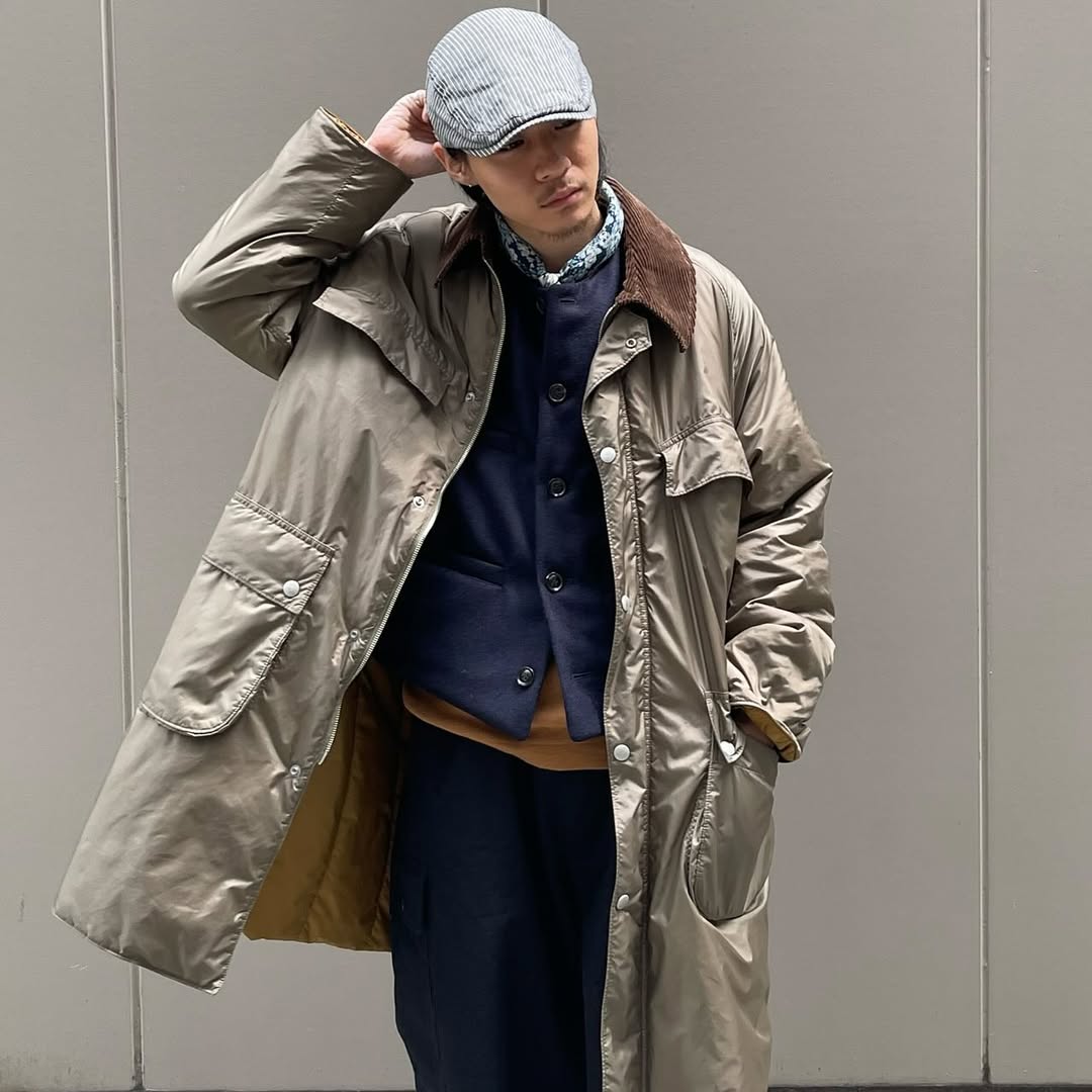 This season’s nylon is thin yet densely woven. Crafted from 70-denier yarn at high density, the fabric is both durable and lighter than it appears. A subtle layer of insulation helps retain warmth, while the lining is finished in a bold, rustic quilt.
