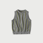 Regimental stripes—the traditional pattern born from cricket—knitted in. Reassuring thickness with a small pocket as an accent. A petit vest that expands styling possibilities.