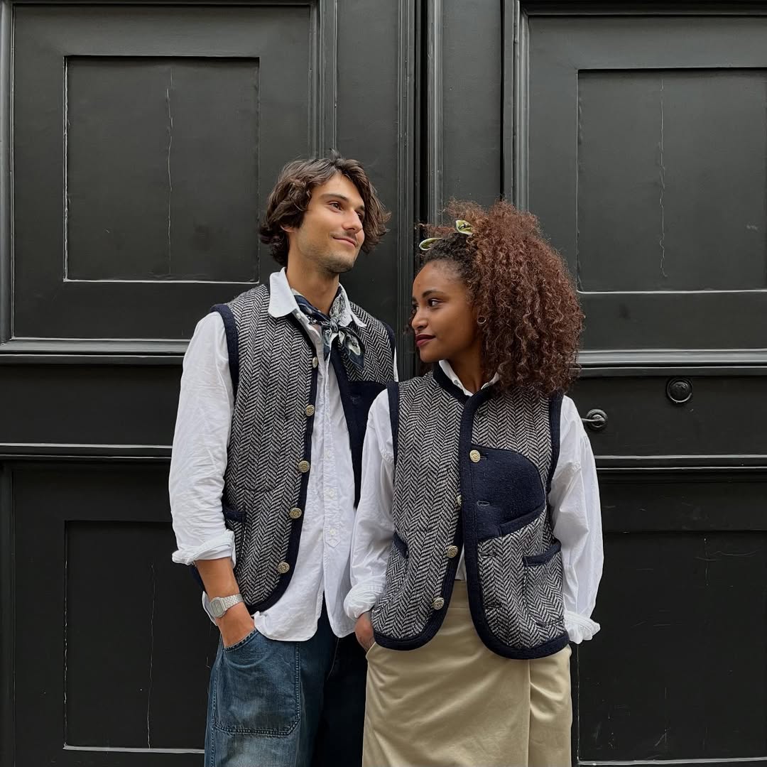 With solid color accents and rounded piping, this warm unisex vest has a charming presence. Its easy layering and comfortable fit around the shoulders make it a versatile piece.