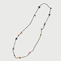 Old tonbo-dama glass beads gathered together, connected with antique-finished charms and chains. Stripes, polka dots, zigzags—the lively patterns of the beads make for a playful accessory.