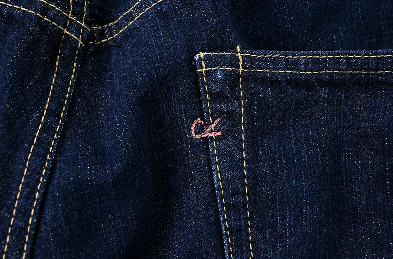 後口袋飾有「R」字刺繡,所用線材染自日本傳統的茜紅(Akane)。隨著穿著與水洗,縫線可能會褪色、磨損,但細看之下,「R」的輪廓依然清晰。刺繡與縫線都會與丹寧一同優雅地老化。中央腰袢在翻起時可見紅色的Selvedge線條,並刻意以斜角縫製。此腰袢所用的Selvedge織帶,是以Ai Indigo丹寧專為此用途特別織成的。