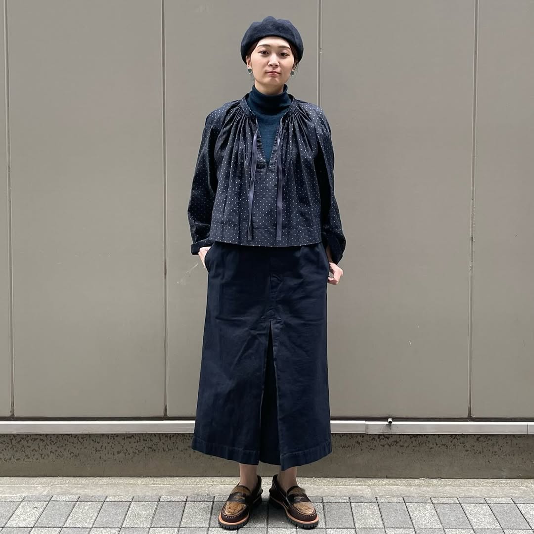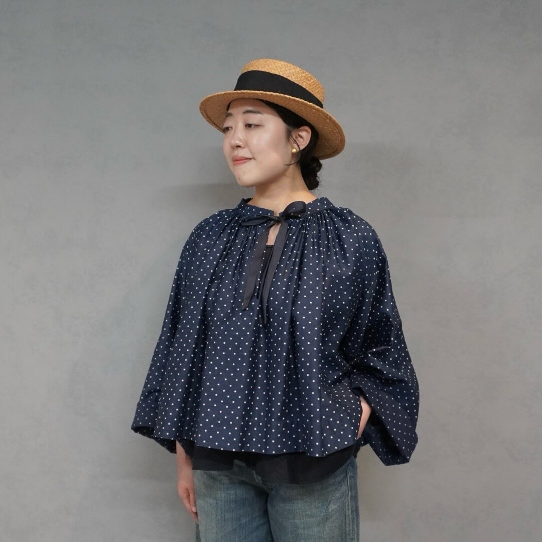 顺滑的棉缎布料,手感舒适。采用瑠璃靛蓝染色——这是我们原创配方,呈现出光泽质感。手绘圆点图案转制成版,再以手工印刷完成。
